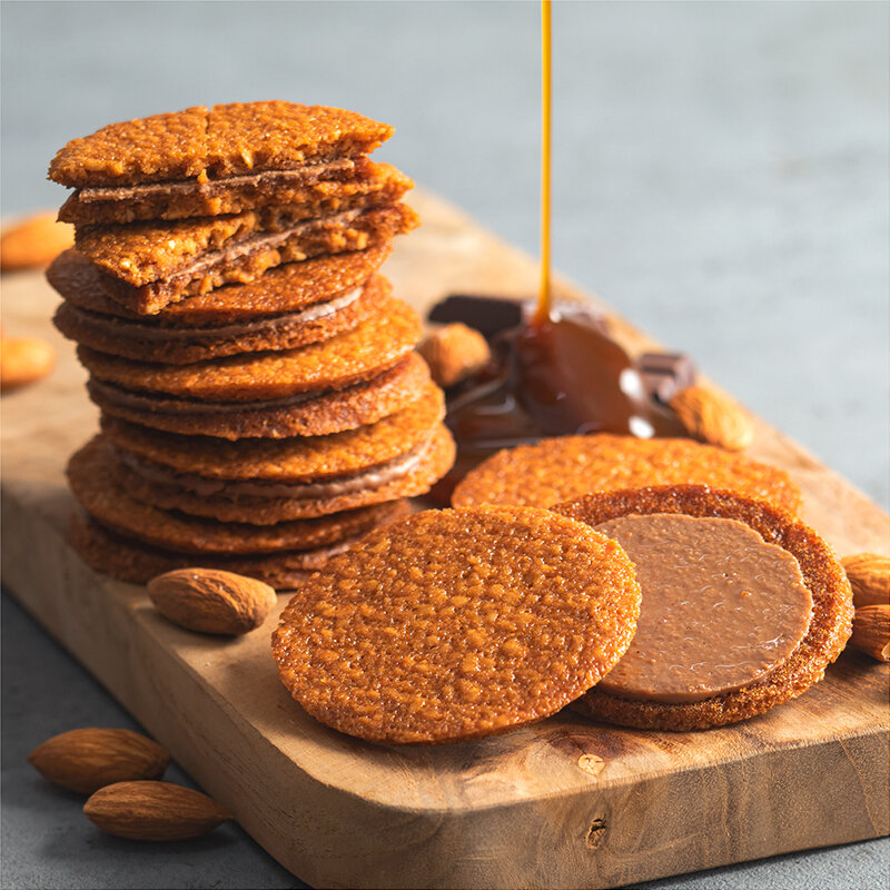 クラッシュアーモンドとアーモンドパウダーを使って香ばしくザクッと焼き上げたクッキーにサンドするのは、ほろ苦く口どけの良いベルギー産キャラメルチョコレート。