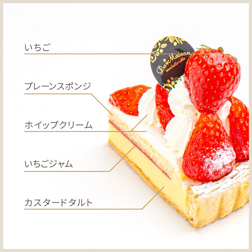 カスタードタルトにスポンジを重ね、甘酸っぱいいちごを飾りました。甘さ控えめのホイップクリームが甘酸っぱいいちごの味を際立たせるシンプルでやさしい味のタルトです。