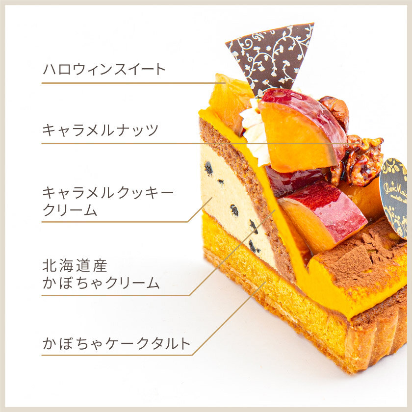 かぼちゃケークタルトに北海道産のかぼちゃクリームとキャラメルクッキークリームを重ね、しっとりとなめらかな食感で上品な甘みとオレンジ色の果肉が特徴のハロウィンスイートを飾りました。