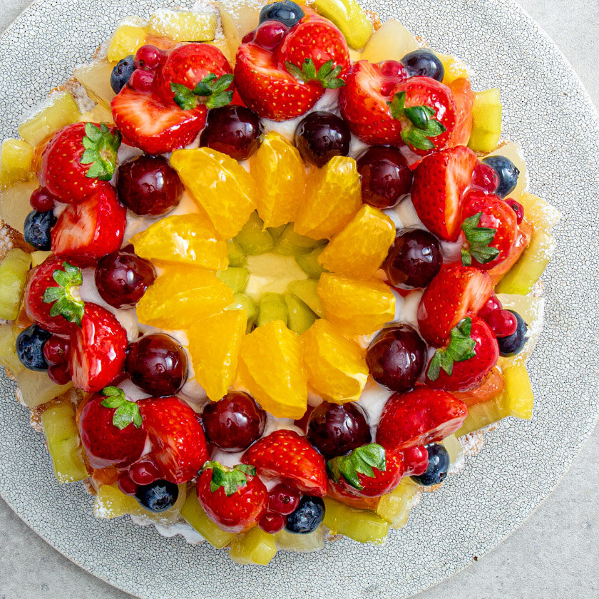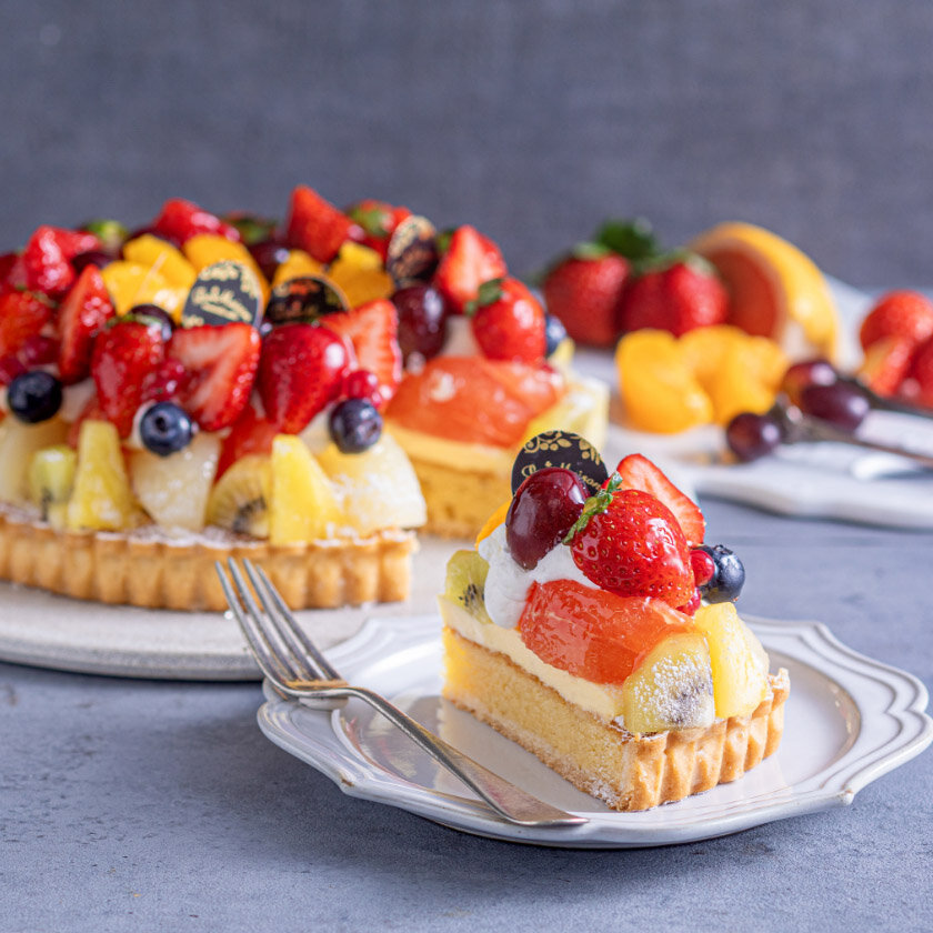 香ばしいアーモンドタルトにカスタードクリームとホイップクリームをしぼり、あまおうやとちあいかなど2種のいちごと8種のフルーツを彩り鮮やかに使用した、季節のフルーツを存分にお楽しみいただけるタルトです。