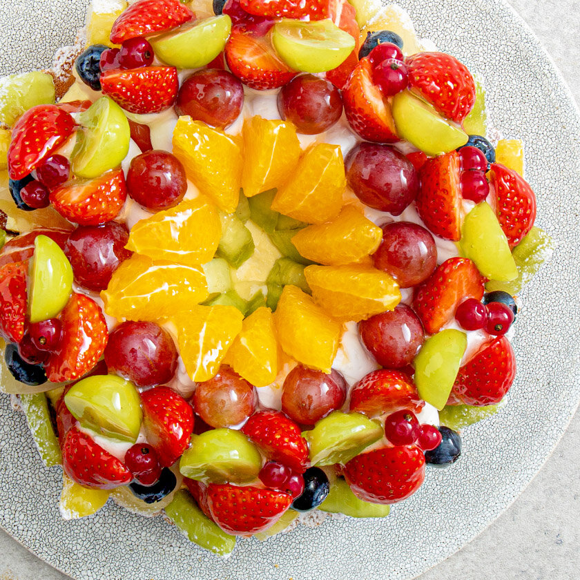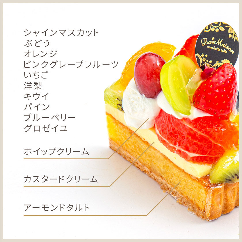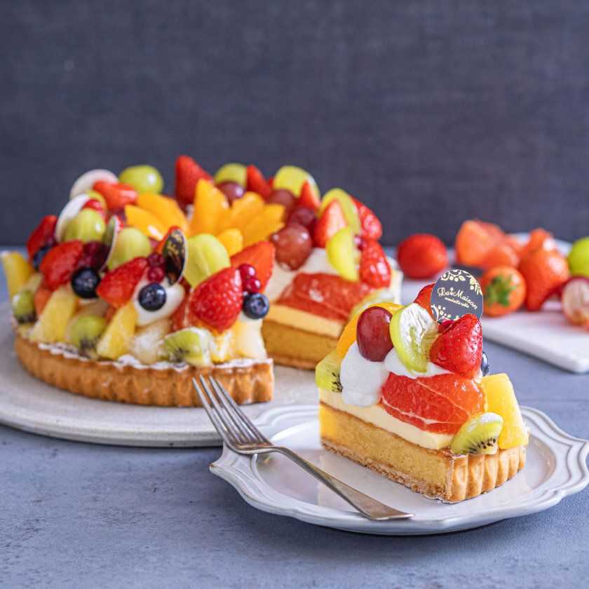香ばしいアーモンドタルトにカスタードクリームとホイップクリームを絞り、シャインマスカットやいちごなど10種のフルーツを彩り鮮やかに使用した、季節のフルーツを存分にお楽しみいただけるタルト。