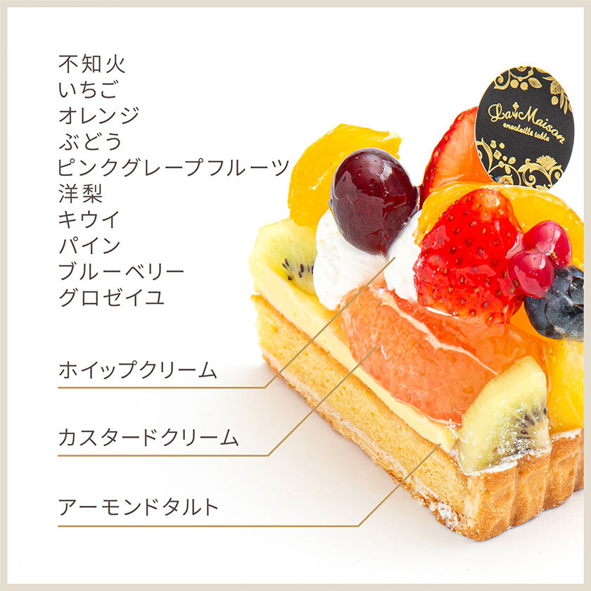 香ばしいアーモンドタルトにカスタードクリームとホイップクリームをしぼり、みずみずしい不知火や9種のフルーツを彩り鮮やかに使用した、季節のフルーツを存分にお楽しみいただけるタルト。