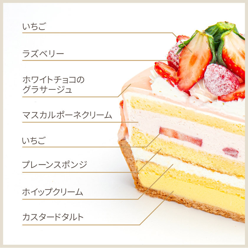 甘酸っぱいいちごとマスカルポーネクリームをふわふわスポンジでサンドし、カスタードタルトに重ねました。ホワイトチョコのグラサージュをかけた華やかなショートケーキタルトです。