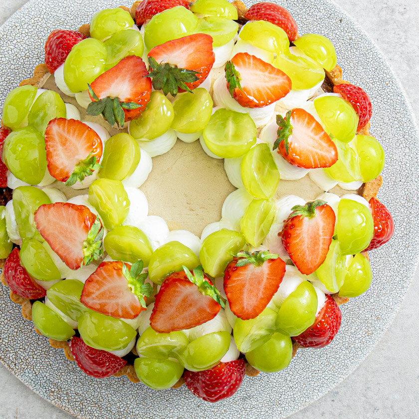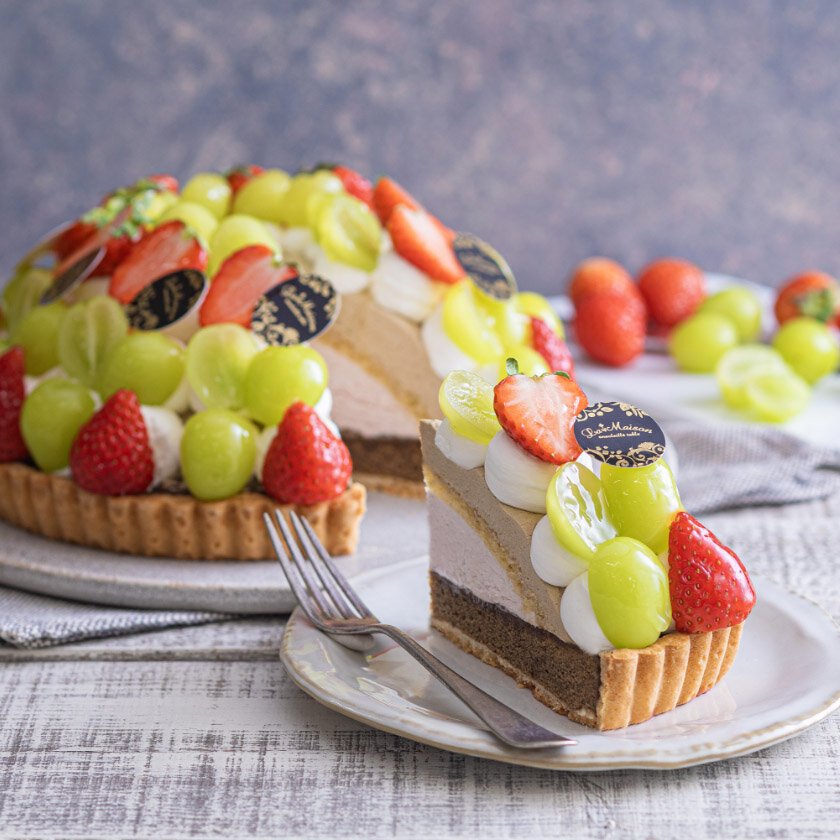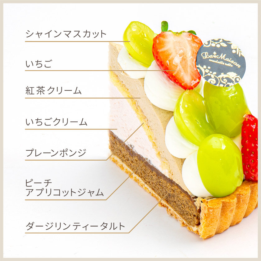 ダージリンティータルトに甘酸っぱいいちごクリームと紅茶クリームを重ね、ピーチアプリコットジャムをしのばせました。紅茶の香りと甘さたっぷりのシャインマスカットをお楽しみいただける限定タルトです。