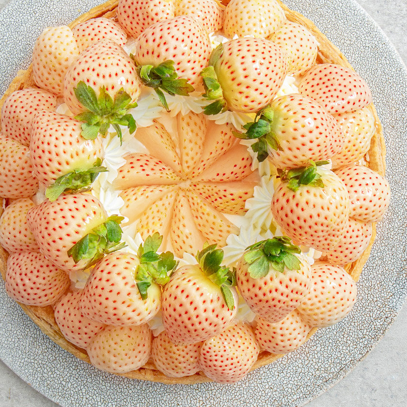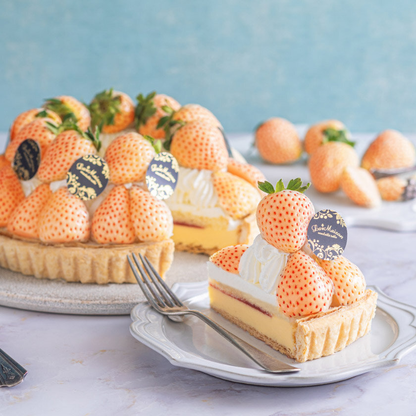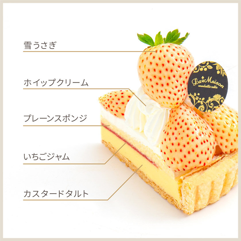カスタードタルトにいちごジャムとホイップクリームを重ね、桃のような香りの白いちご「雪うさぎ」を贅沢に使った季節限定プレミアムタルトです。