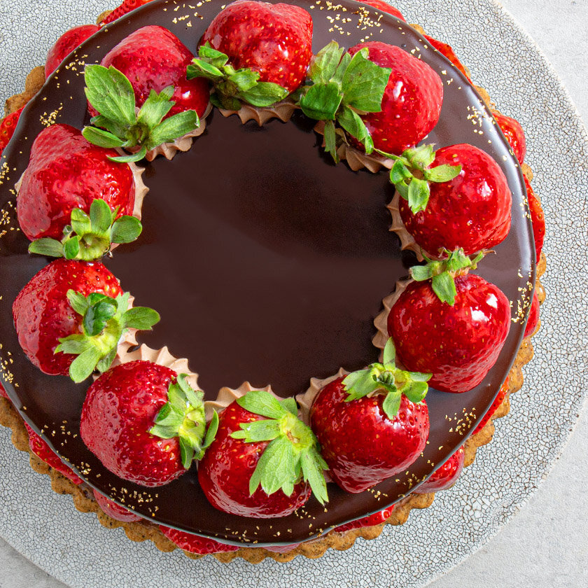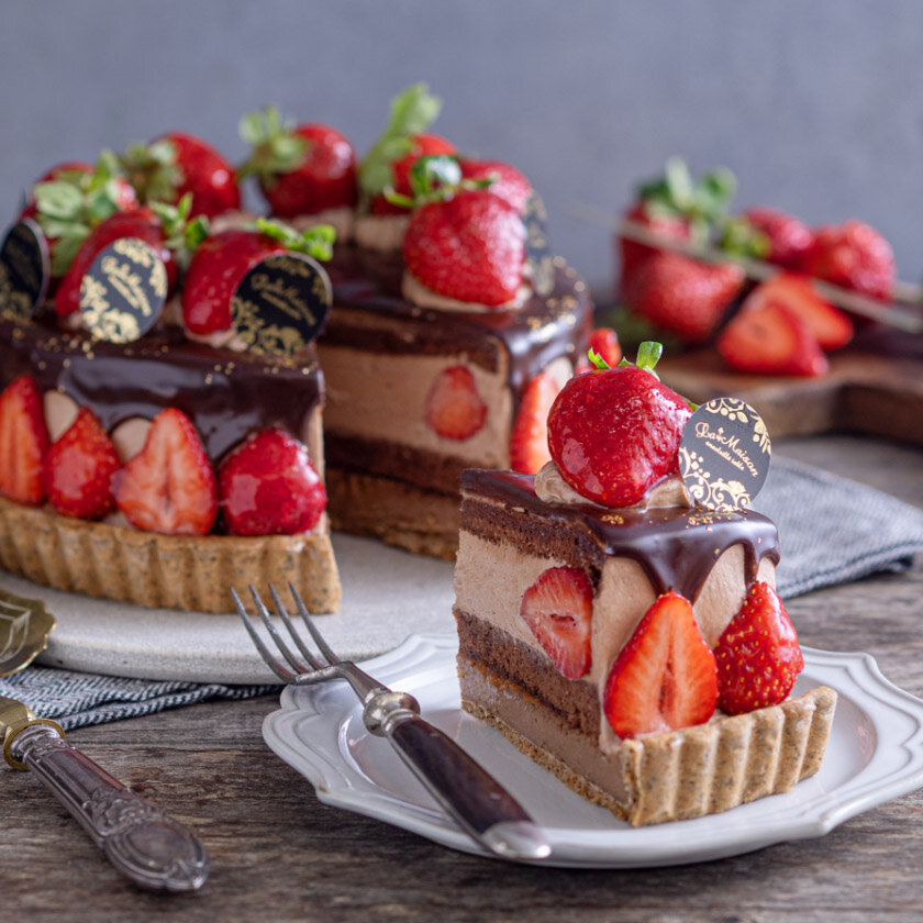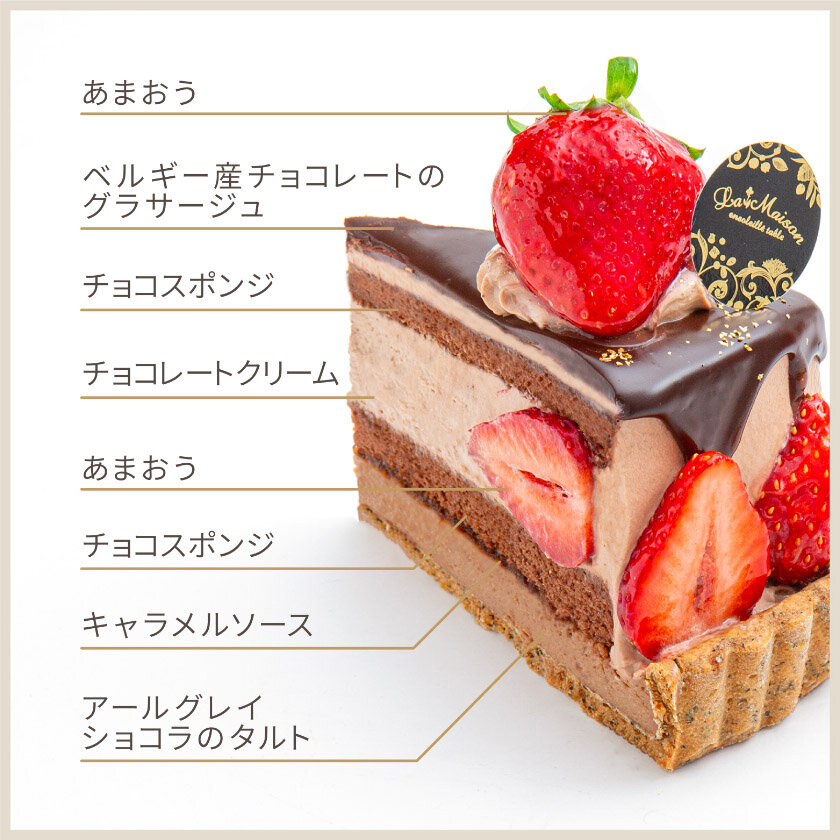 香り高いアールグレイショコラのタルトにとろけるキャラメルソースをサンドし、ベルギー産チョコレートのグラサージュをかけました。甘酸っぱくみずみずしいあまおうと濃厚なチョコレートの味わいをお楽しみいただけます。