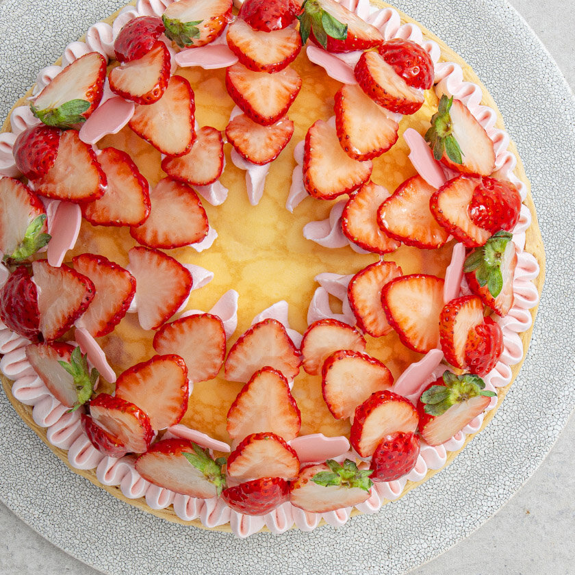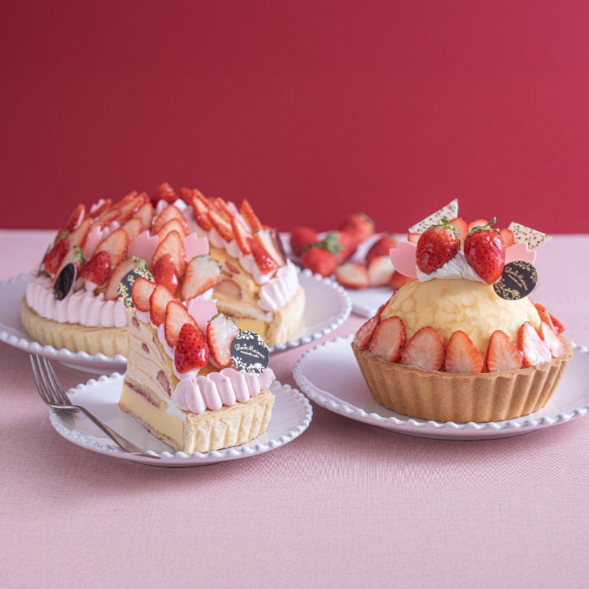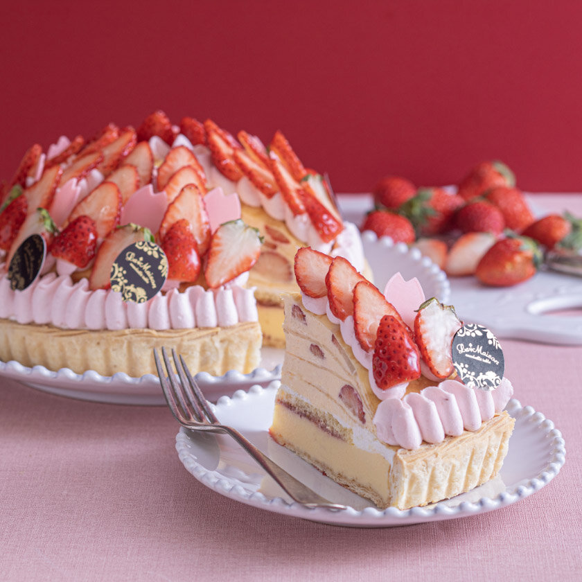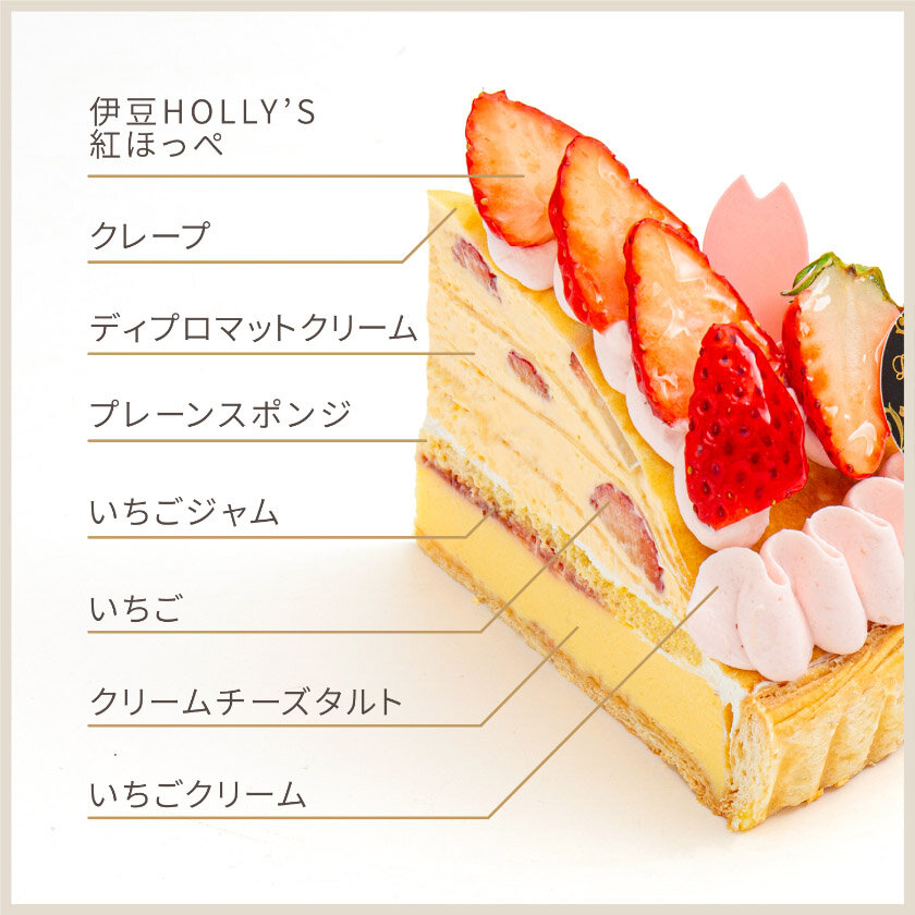 やさしい甘さのクリームチーズタルトにいちごとディプロマットクリームをサンドし、クレープを重ねました。いちごの果肉感とクリームチーズの酸味をお楽しみいただけます。