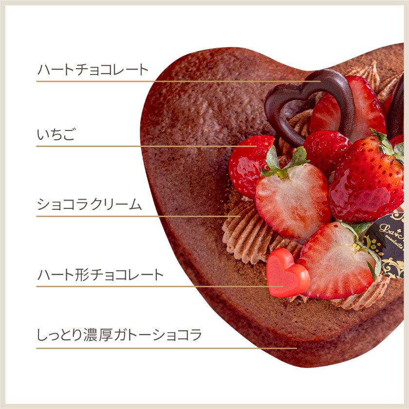 しっとり焼き上げた濃厚なガトーショコラ。甘酸っぱいいちごを飾り、可愛らしいハートチョコレートをあしらいました。