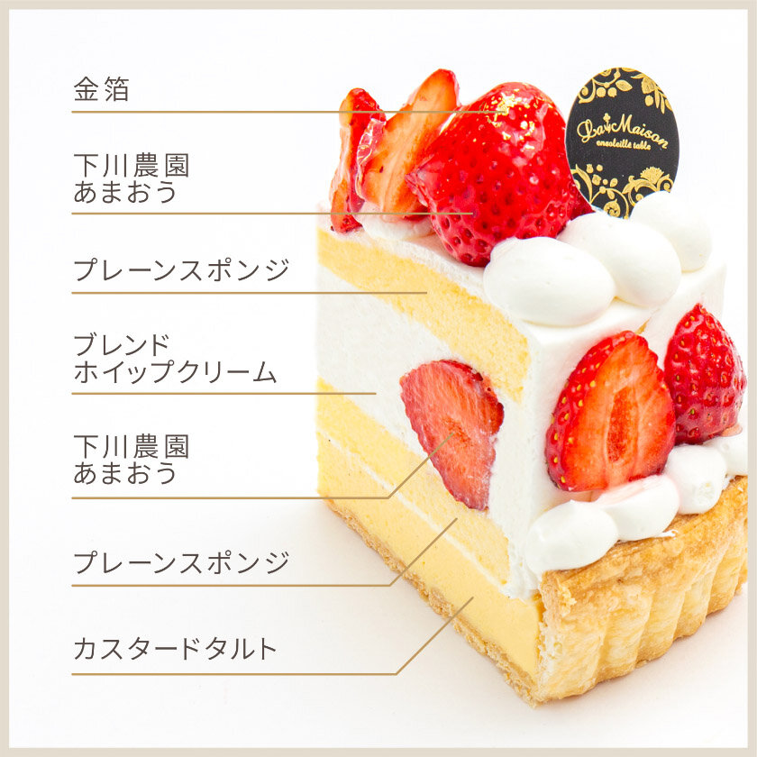 下川農園こだわりの濃厚な甘さと酸味を味わえるあまおうを丸ごと包みこんだショートケーキタルト。なめらかのカスタードクリームと優しい甘さのホイップ、あまおうの甘酸っぱさをお楽しみいただけます。