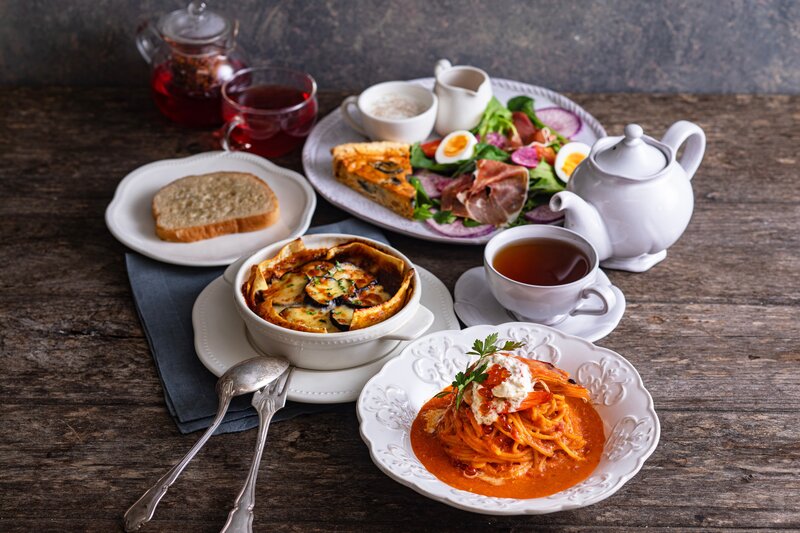 牛肉を粗挽きにし、赤ワインでじっくり煮込んだ自家製のラグーソースとクリーミーなホワイトソースのラザニアに岡山県の千両なすをのせて。