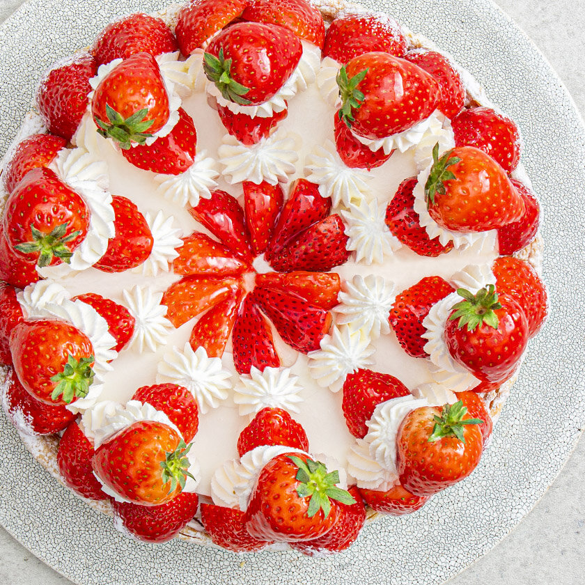 カスタードタルトにスポンジを重ね、甘酸っぱいいちごを飾りました。甘さ控えめのホイップクリームが甘酸っぱいいちごの味を際立たせるシンプルでやさしい味のタルトです。
