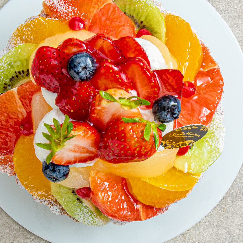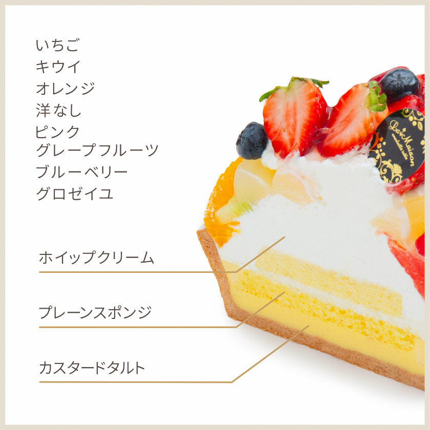 カスタードクリームのタルトにホイップクリームを重ね、7種のフルーツを彩り鮮やかに飾りました。
