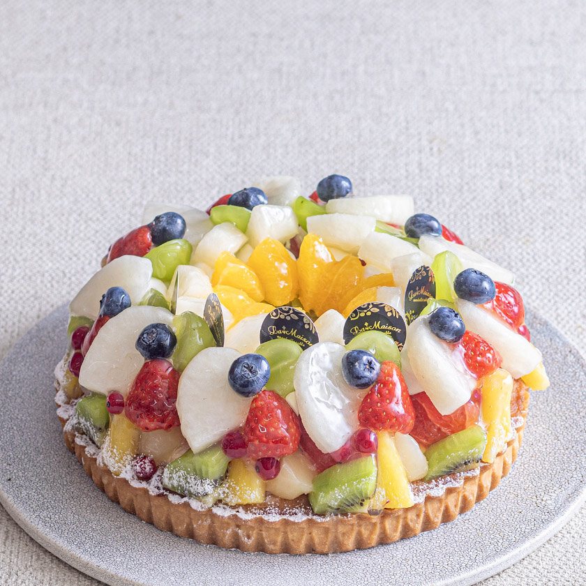 カスタードクリームのタルトにホイップクリームを重ね、香りの良いシャインマスカットと7種のフルーツを彩り鮮やかに飾りました。