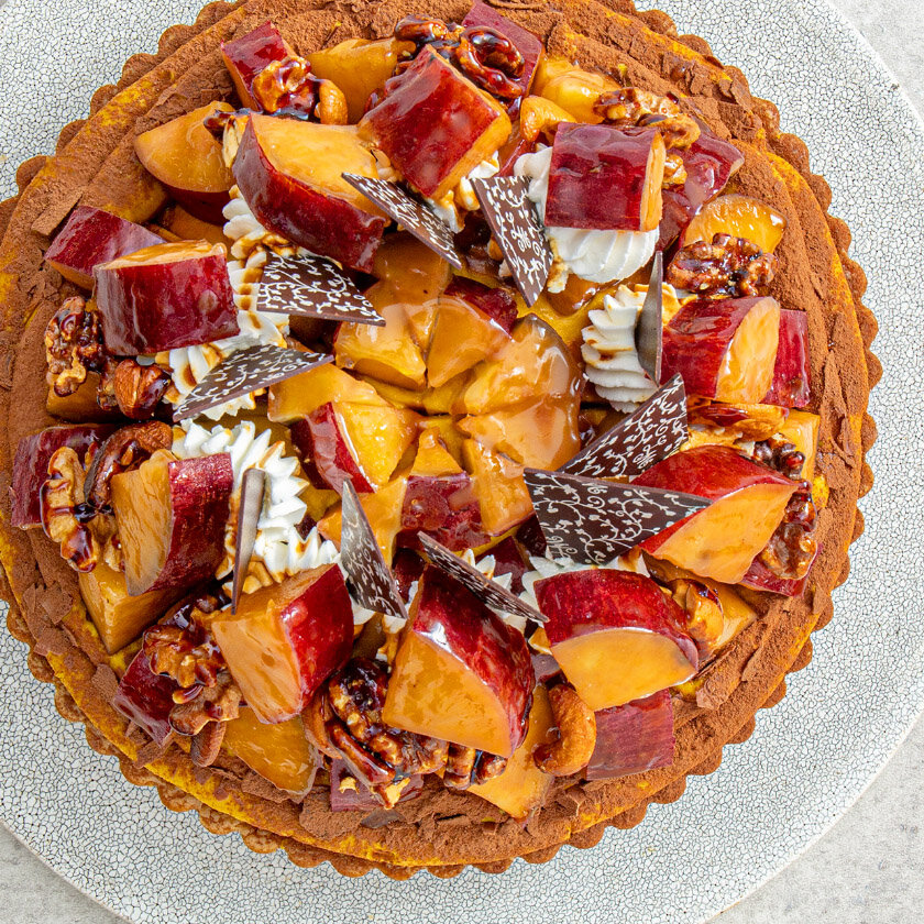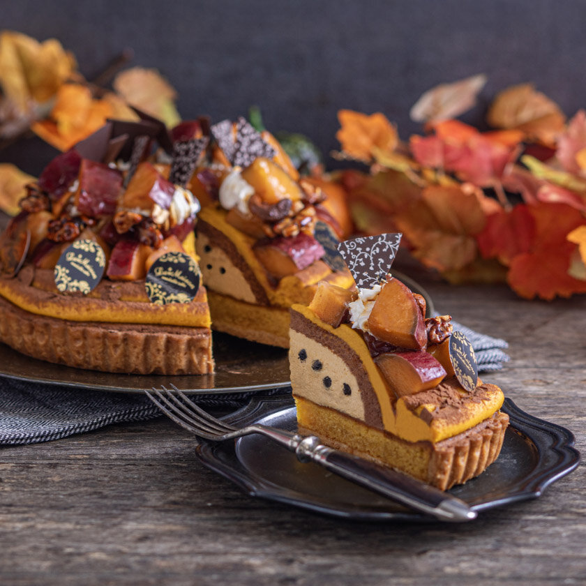 かぼちゃケークタルトに北海道産のかぼちゃクリームとキャラメルクッキークリームを重ね、しっとりとなめらかな食感で上品な甘みとオレンジ色の果肉が特徴のハロウィンスイートを飾りました。