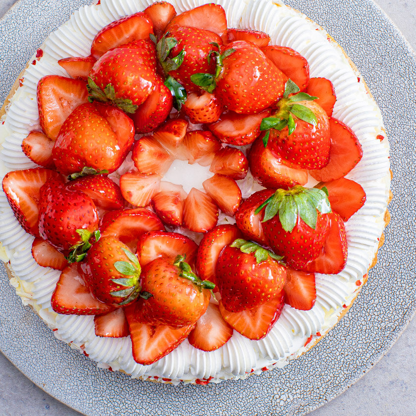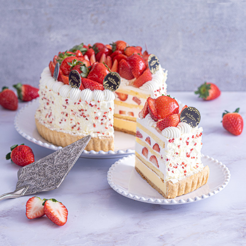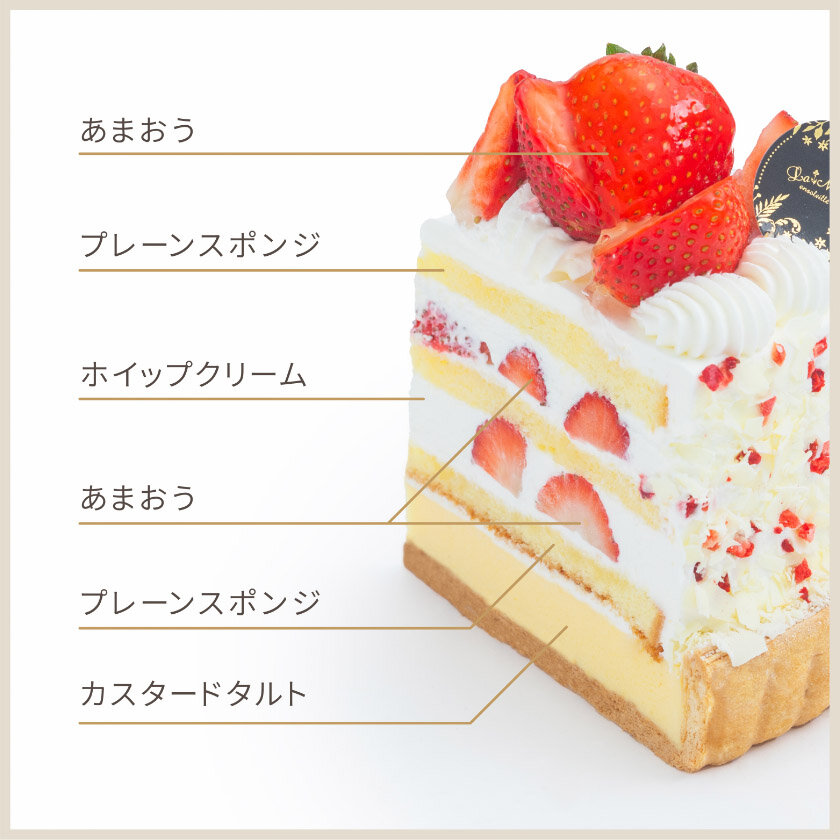 カスタードタルトにふわふわのスポンジとやさしい甘さのホイップクリームを重ね、みずみずしく甘酸っぱいあまおうを贅沢に使用したショートケーキタルト。