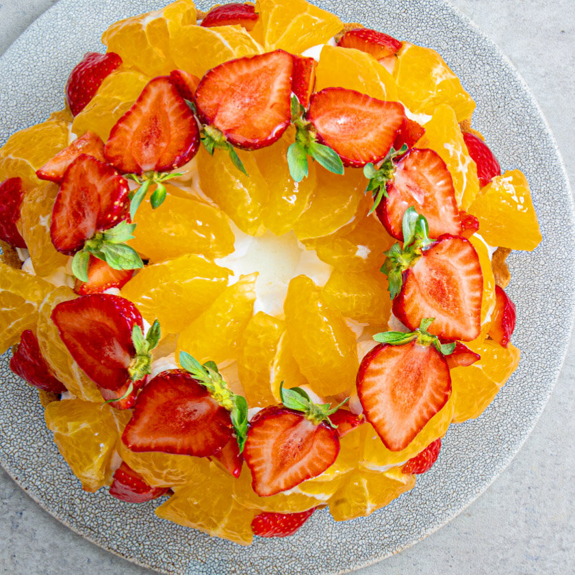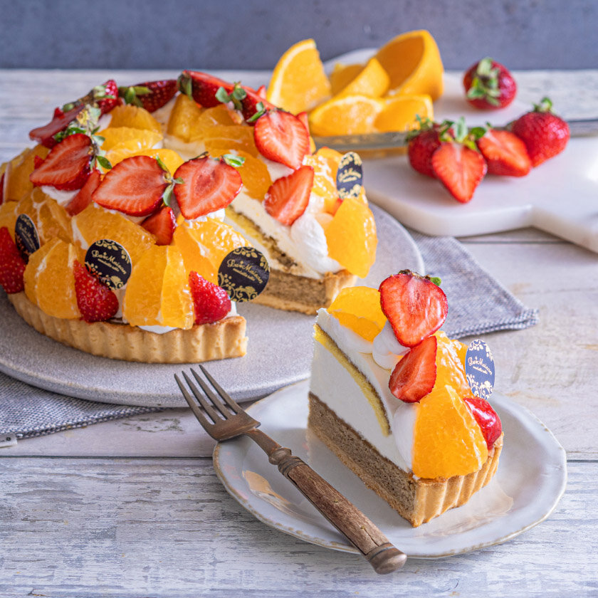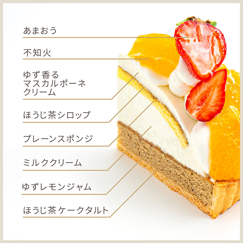 香ばしいほうじ茶ケークタルトにさわやかなゆず香るマスカルポーネクリームを重ね、みずみずしい不知火とあまおうを飾りました。