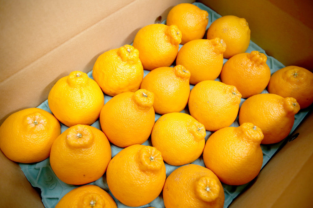 「不知火(しらぬい)」は「清見」と「ポンカン」のかけあわせで生まれた柑橘。「デコポン」という愛称の方が馴染みのある方が多いかもしれません。その違いは定めた基準を満たしJAを通してるかどうか。品種は同じです。