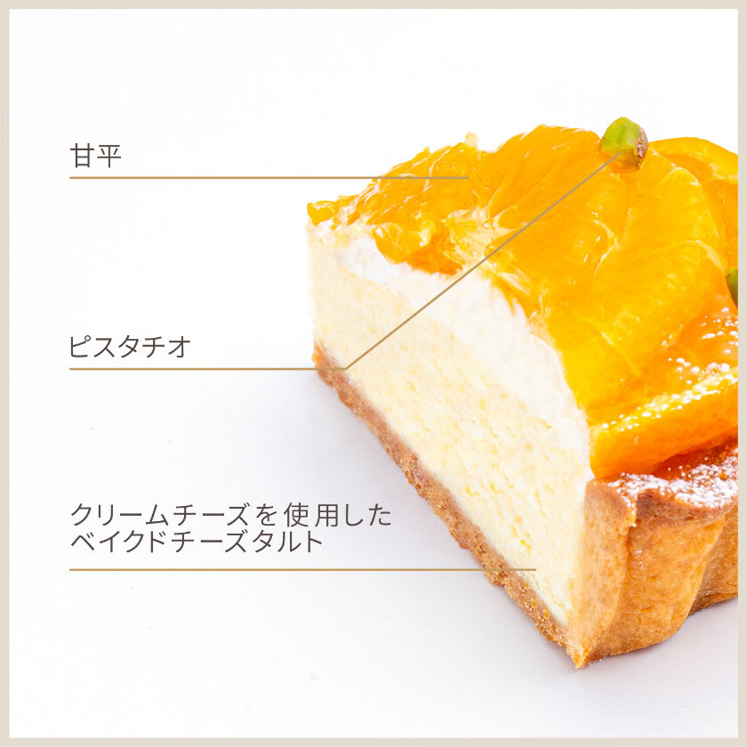 濃厚なベイクドチーズタルトに濃厚な甘みとプチプチとした果肉が特長の甘平とピスタチオを飾りました。