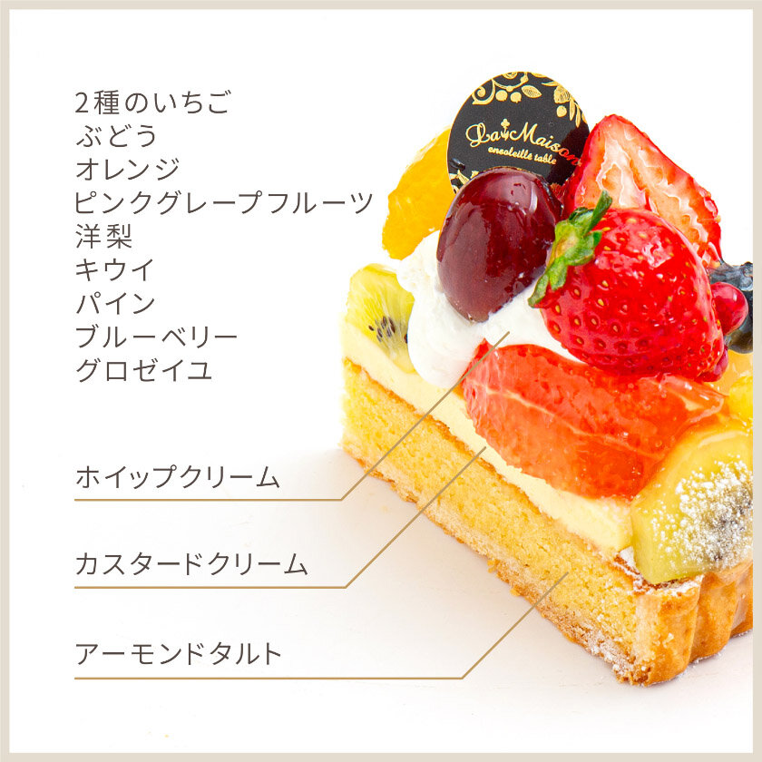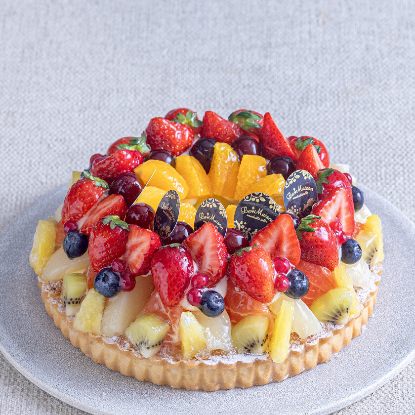 香ばしいアーモンドタルトにカスタードクリームとホイップクリームをしぼり、あまおうやとちあいかなど2種のいちごと8種のフルーツを彩り鮮やかに使用した、季節のフルーツを存分にお楽しみいただけるタルトです。