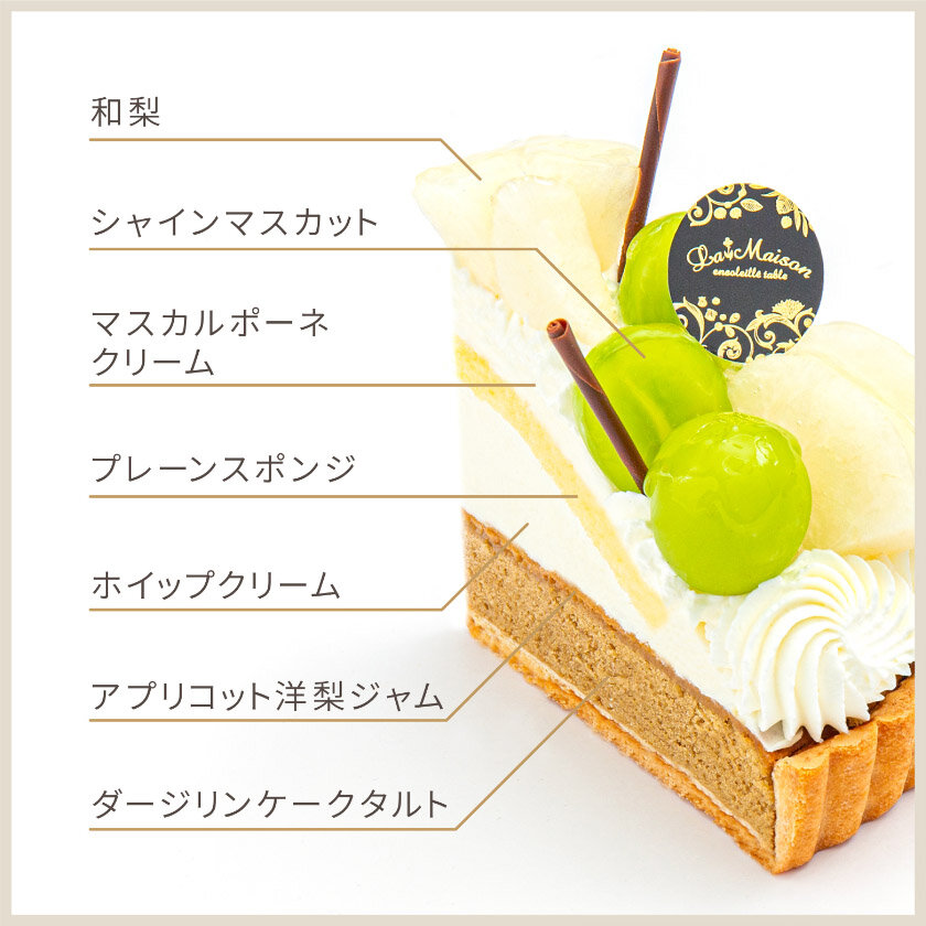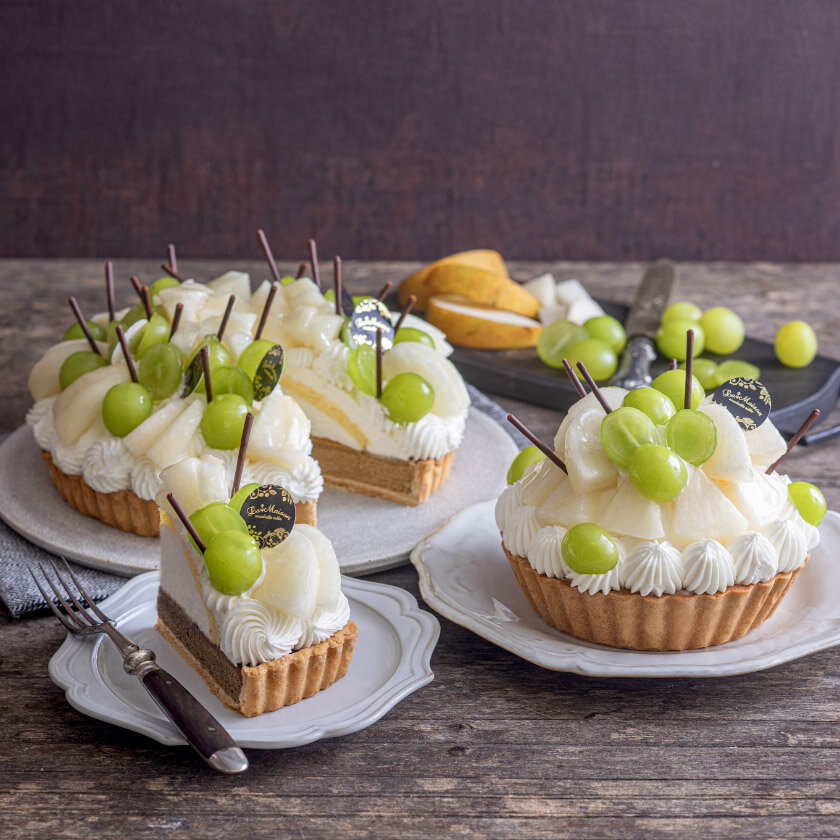 ダージリンケークタルトにアプリコット洋梨ジャムをしのばせ、マスカットクリームを重ねました。みずみずしい和梨とシャインマスカットの華やかな甘みを紅茶の香りやマスカルポーネクリームと一緒にお楽しみいただけます。