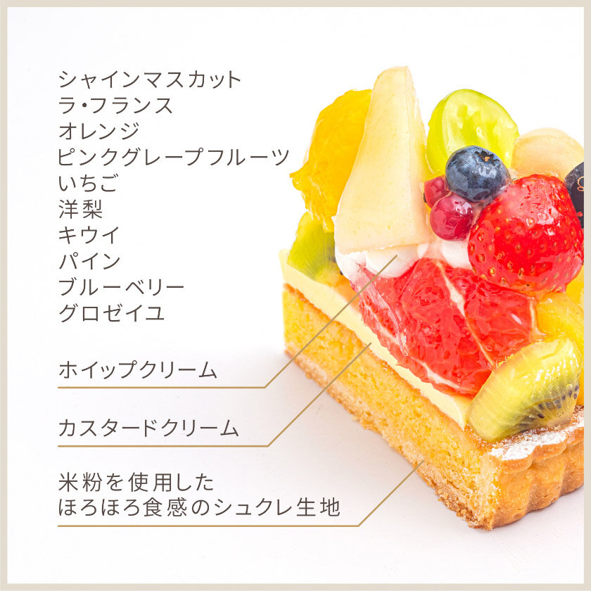 米粉を使用したほろほろ食感のシュクレ生地にクレーム・ダマンドを流し込み焼き上げ、カスタードクリームとホイップクリームを絞りました。