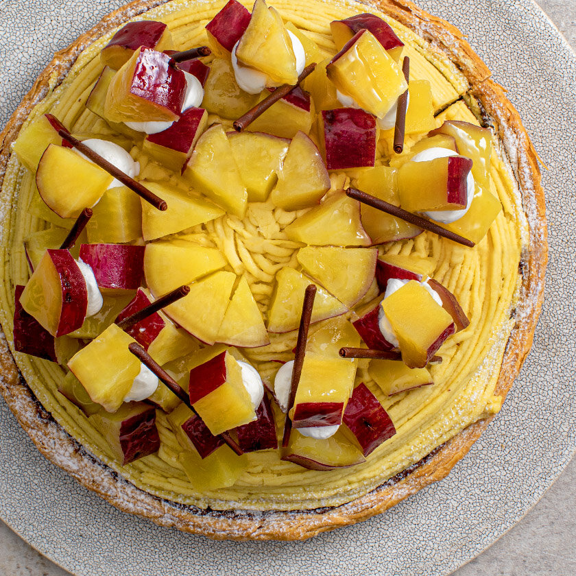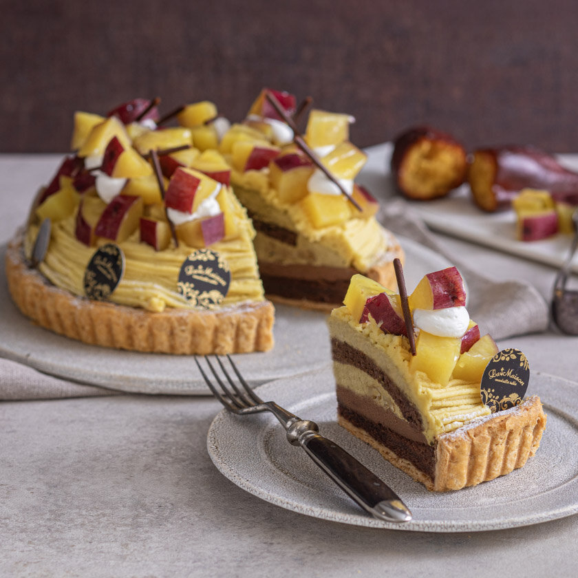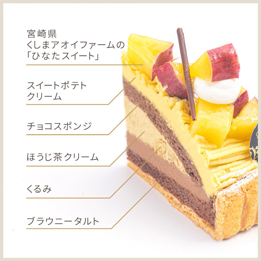 しっとりと上品な甘さが特長のくしまアオイファームの『ひなたスイート』を使用したタルト。ブラウニータルトに香り高いほうじ茶クリームを重ね、なめらかなスイートポテトクリームをモンブラン風にしぼりました。