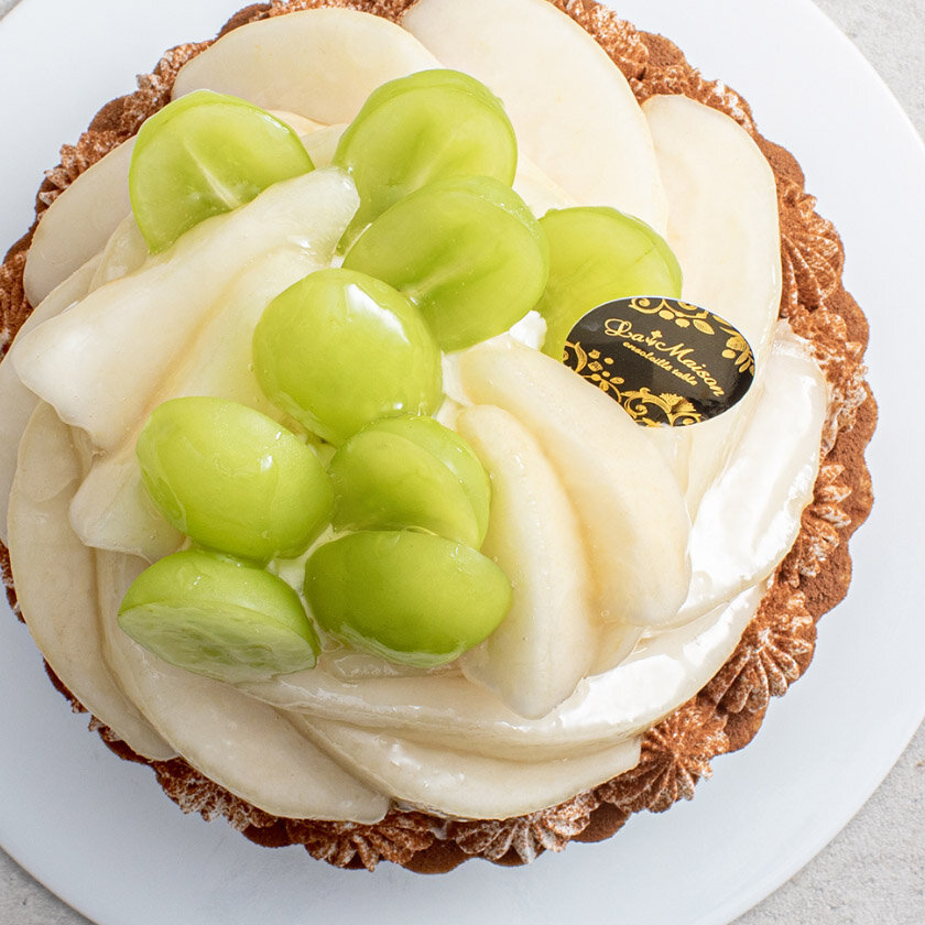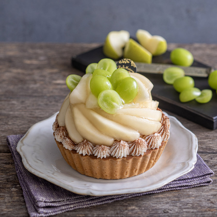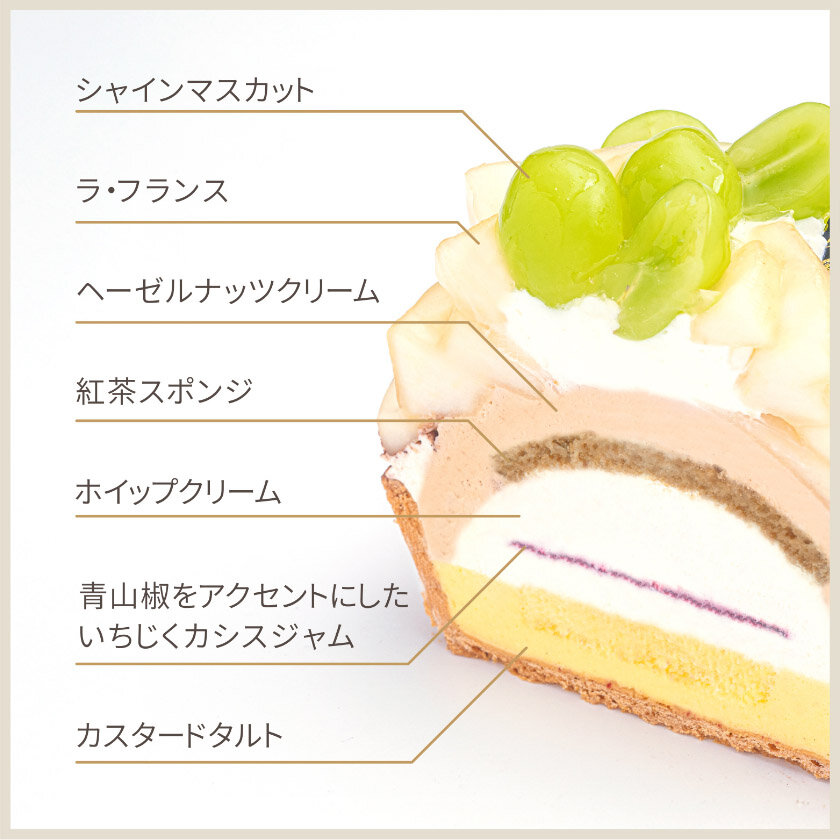芳醇な香りのラ・フランスと爽やかなシャインマスカットを飾ったタルト。カスタードタルトに華やかな香りの青山椒をアクセントにしたいちじくカシスジャムをしのばせ、ヘーゼルナッツクリームを重ねました。