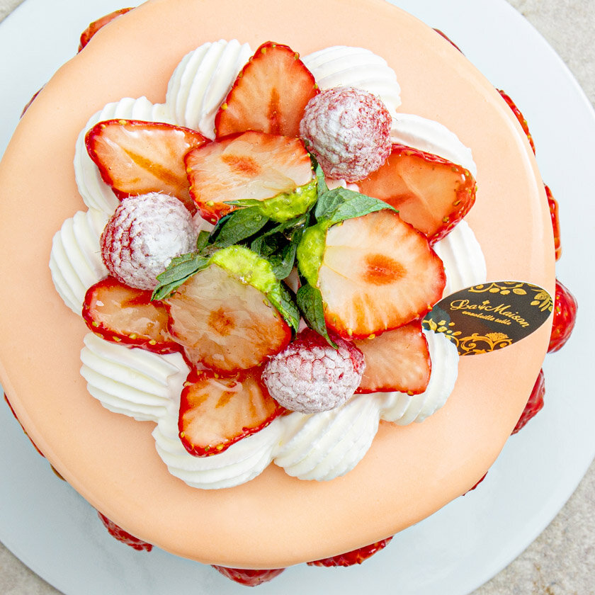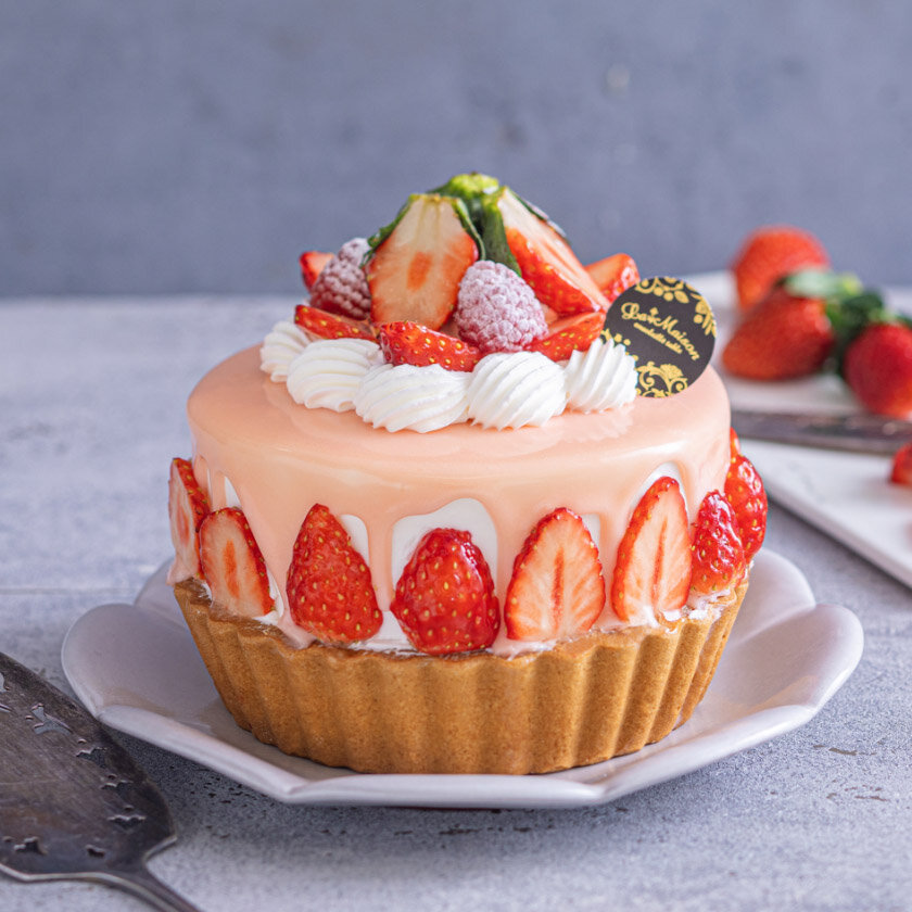 甘酸っぱいいちごとマスカルポーネクリームをふわふわスポンジでサンドし、カスタードタルトに重ねました。ホワイトチョコのグラサージュをかけた華やかなショートケーキタルトです。