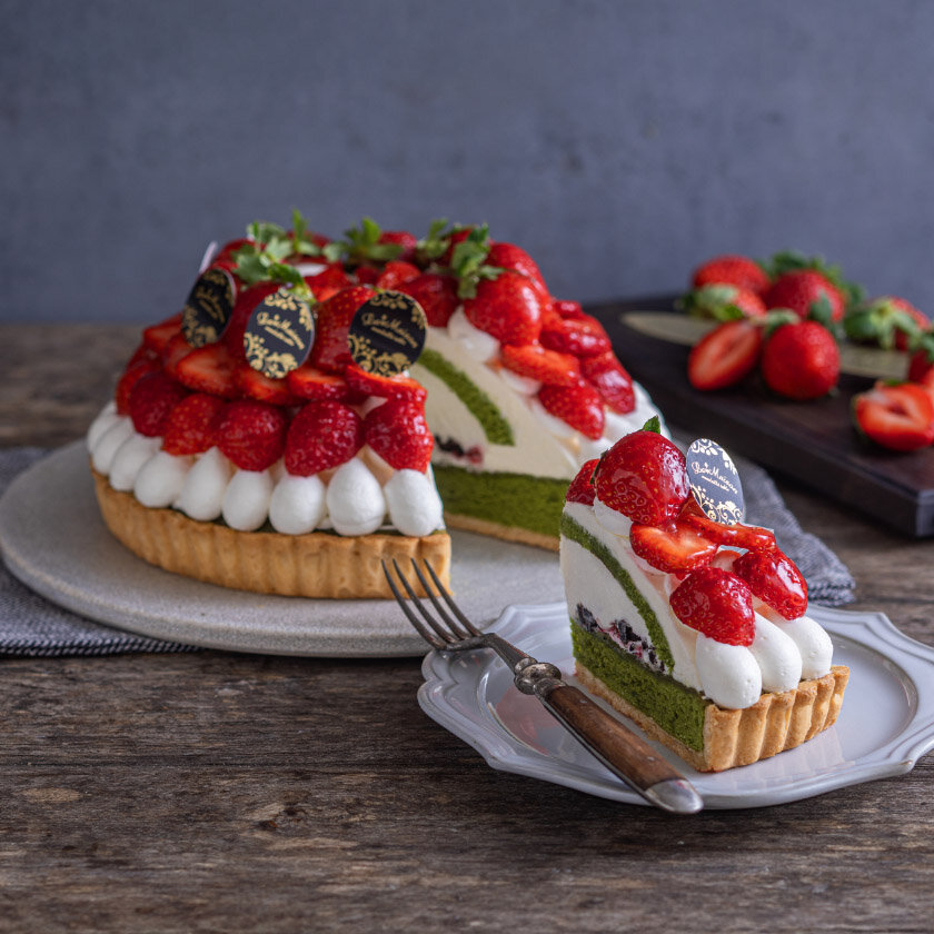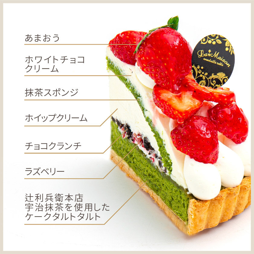 香りと旨みの強い辻利兵衛本店宇治抹茶を使用したケークタルトにチョコクランチとホワイトチョコクリームを重ね、甘酸っぱいあまおう飾りました。