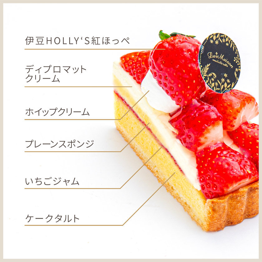 しっとりとしたケークタルトに優しい甘さのディプロマットクリームと甘酸っぱいいちごジャムをしのばせました。みずみずしく、コクのある甘みの伊豆HOLLY'S紅ほっぺを贅沢に使用したタルトです。
