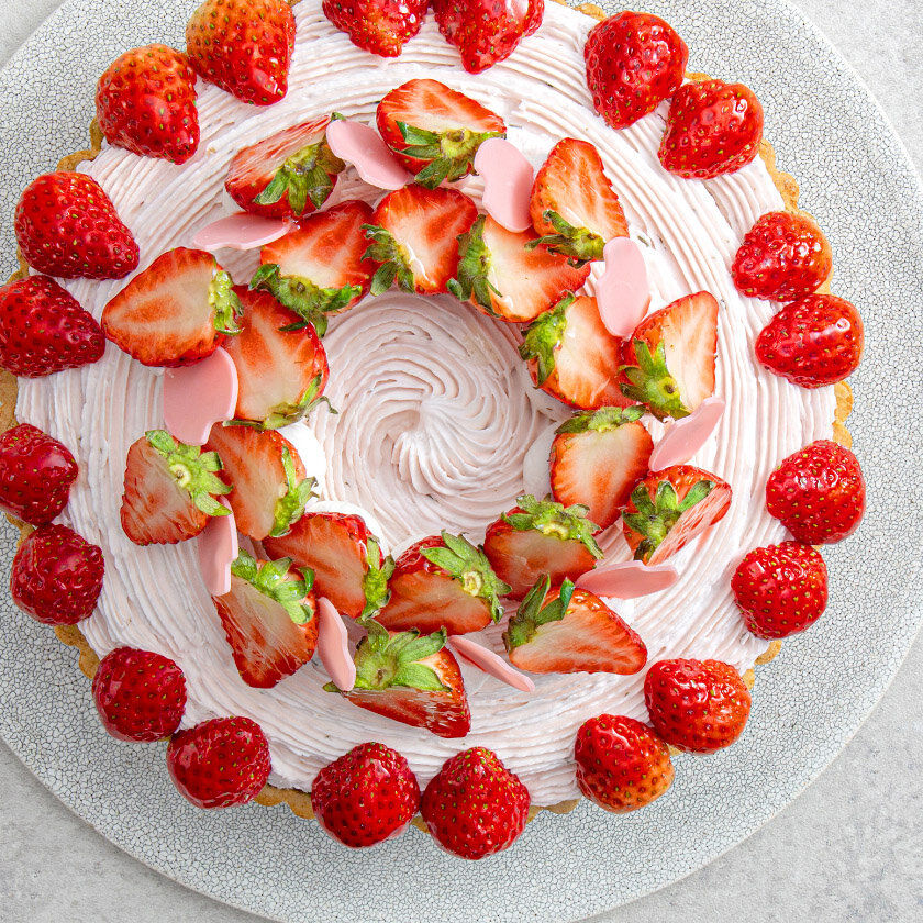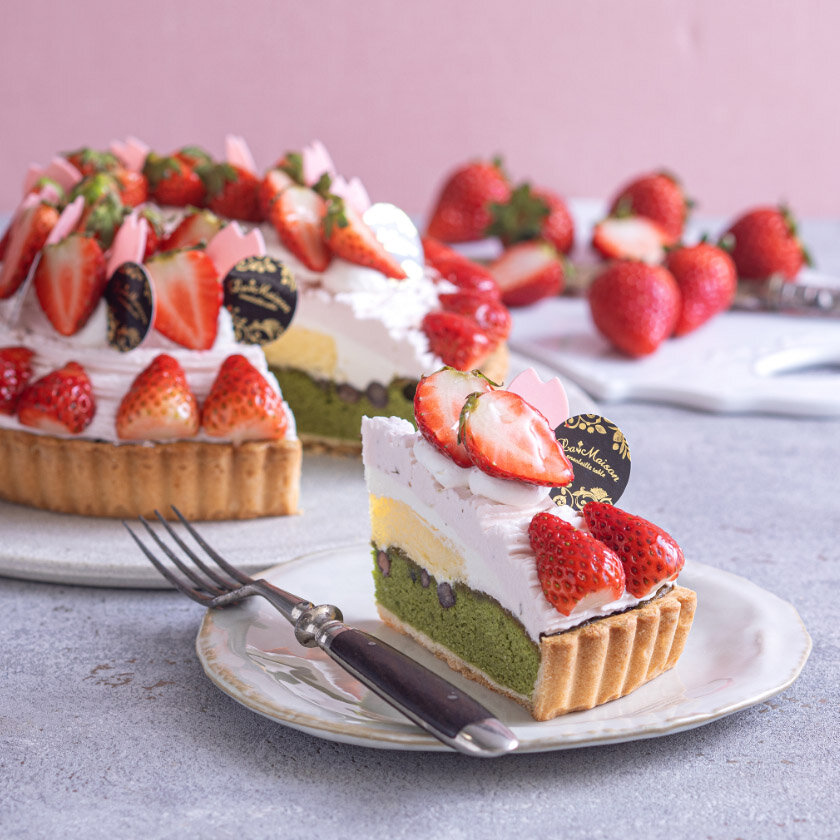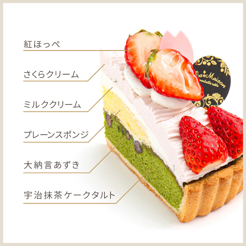 香り高い宇治抹茶ケークタルトに大納言あずきをしのばせ、桜餡を使用したさくらクリームをしぼりました。甘酸っぱい紅ほっぺを飾った、春の訪れを感じるタルトです。