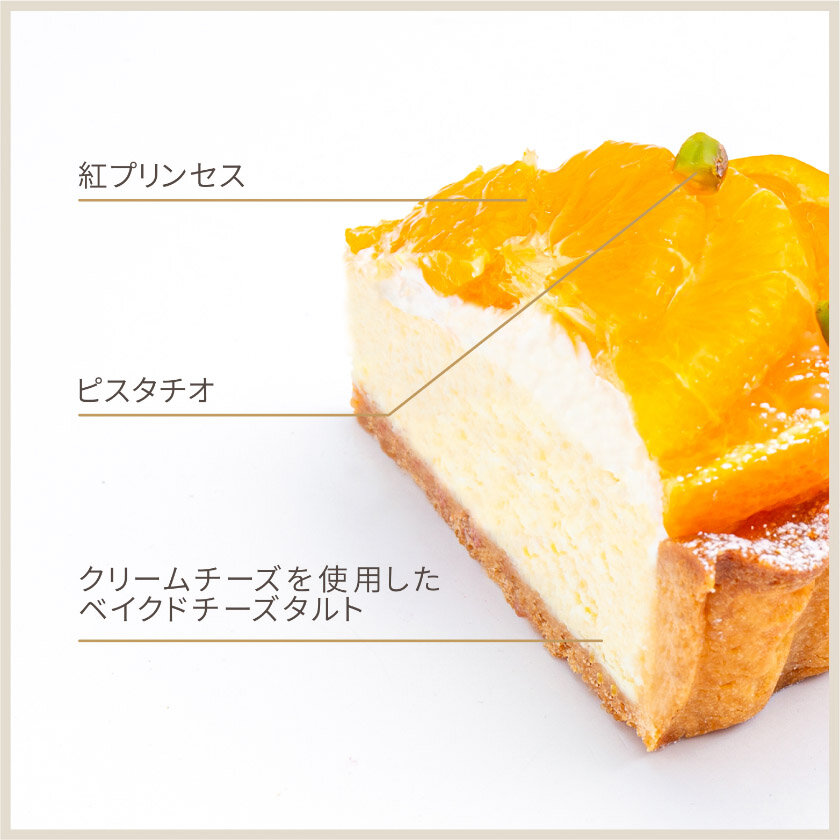 濃厚なベイクドチーズタルトに果汁たっぷりで濃厚な甘みが特長の愛媛県オリジナル柑橘の紅プリンセスを飾りました。