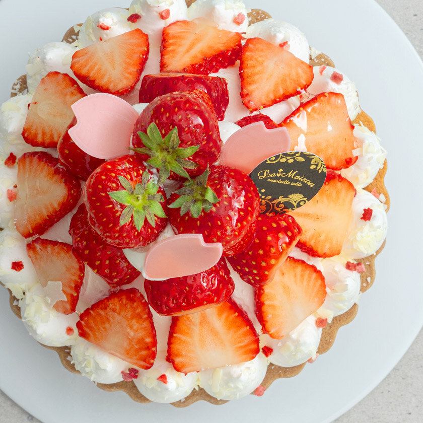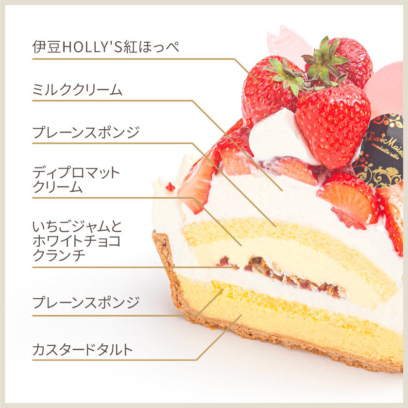 カスタードタルトにいちごクリームとディプロマットクリームを重ね、いちごジャムとホワイトチョコクランチをしのばせ、甘酸っぱく濃厚な甘さの伊豆HOLLY'S紅ほっぺを飾りました。
